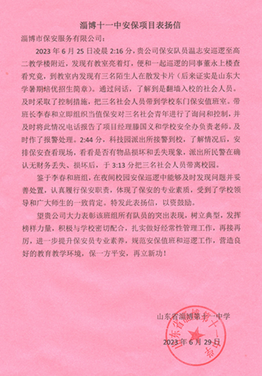 近日,淄博市校園安保抓到三名社會(huì)人員翻墻入校散發(fā)暑期培優(yōu)招生簡(jiǎn)章,及時(shí)采取控制措施并報(bào)告校方安辦負(fù)責(zé)人,同時(shí)進(jìn)行報(bào)警處理。得到了校方的一致好評(píng),并送上了表?yè)P(yáng)信。